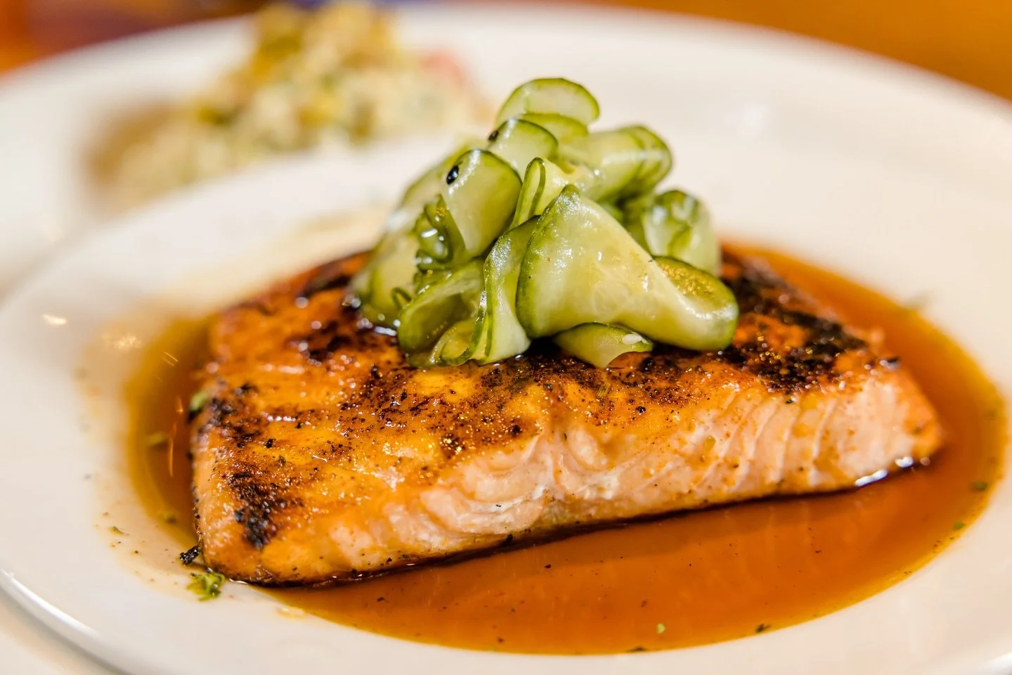 Fresh salmon pattied in house. Blackened & grilled medium with Asian slaw, Thai mayonnaise & marinated cucumbers
