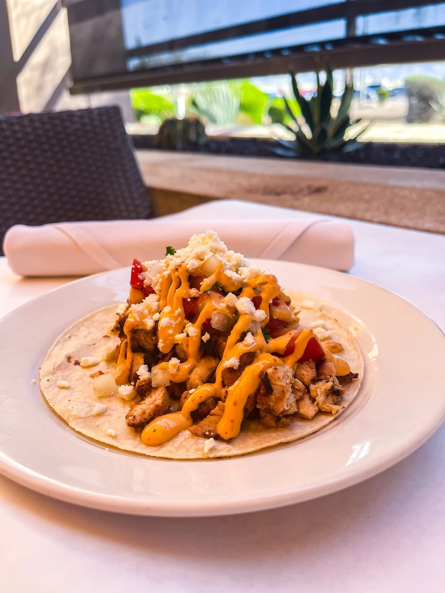 An open-faced corn/flour tortilla with choice of chicken or shrimp, blackening seasoning, freshly made guacamole, salsa, fresh cilantro, queso fresco & a chipotle drizzle