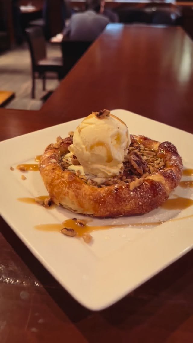A warm, flaky puff pastry crust filled with cinnamon apples. Topped with walnuts, caramel sauce & French vanilla ice cream